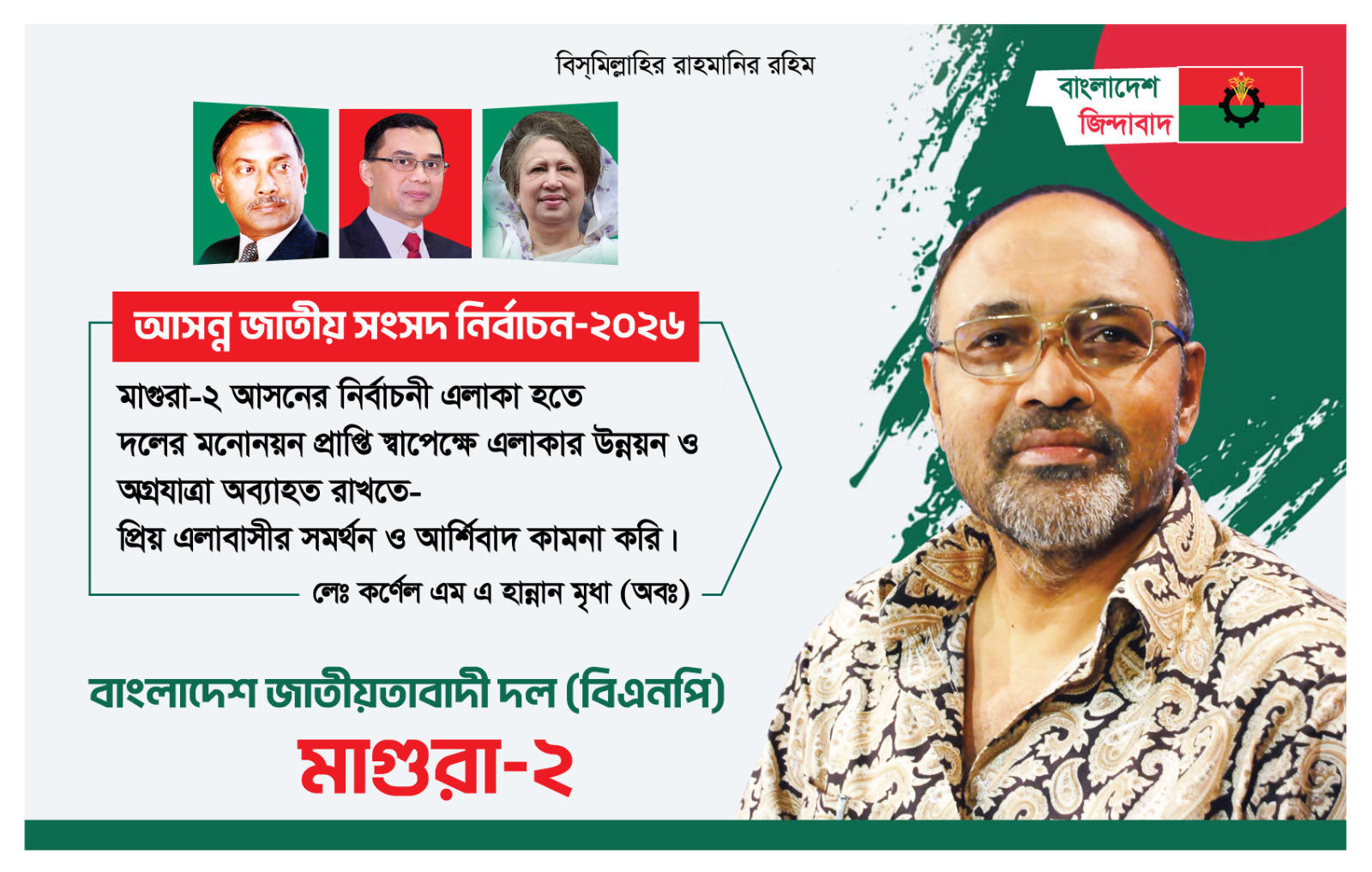 “বাংলাদেশ জাতীয়তাবাদী জিন্দাবাদ”—এই মূলমন্ত্রকে ধারণ করে মাগুরা-২ আসনে আগামী জাতীয় সংসদ নির্বাচনে অংশ নিতে প্রস্তুতি নিচ্ছেন মুক্তিযোদ্ধা, সাবেক সেনা কর্মকর্তা ও রাজনৈতিক নেতা লে. কর্নেল এম এ হান্নান মৃধা (অব.)।