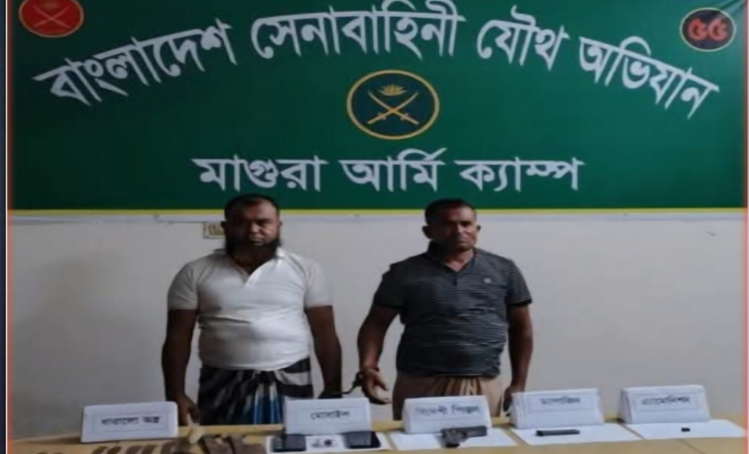 মাগুরায় সেনাবাহিনী ও পুলিশের বিশেষ অভিযানে আগ্নেয়াস্ত্রসহ দুই ভাইকে আটক করা হয়েছে। আটককৃতরা হলেন সদর উপজেলার পারলা গ্রামের মৃত রুস্তম বিশ্বাসের ছেলে মোস্তাক বিশ্বাস (৩৭) ও তার বড় ভাই মোহাম্মদ দাউদ আলী বিশ্বাস (৪৬)।